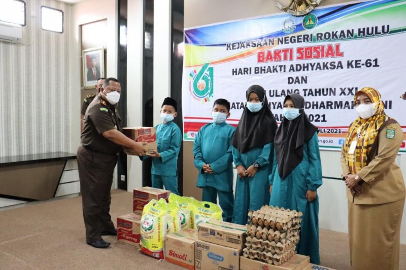 Rohul-Nusapos-Com| Kejaksaan Negeri (Kejari) Pasir Pengaraian, Kabupaten Rokan Hulu (Rohul) menggelar kegiatan Bhakti sosial (Bhaksos) dengan cara berbagi dengan keluarga yang kurang mampu, kegiatan ini sendiri dalam rangka memperingati Hari Bhakti Adhyaksa Ke-61 dan Hari Ulang Tahun XXI Ikatan Adhyaksa Dharmakarini Tahun 2021 yang bertempat di Aula Baharuddin Lopa kantor Kejari Rokan Hulu. Selasa 13/07/2021.
